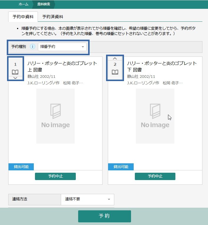 例:「上巻」「下巻」を順番予約した場合