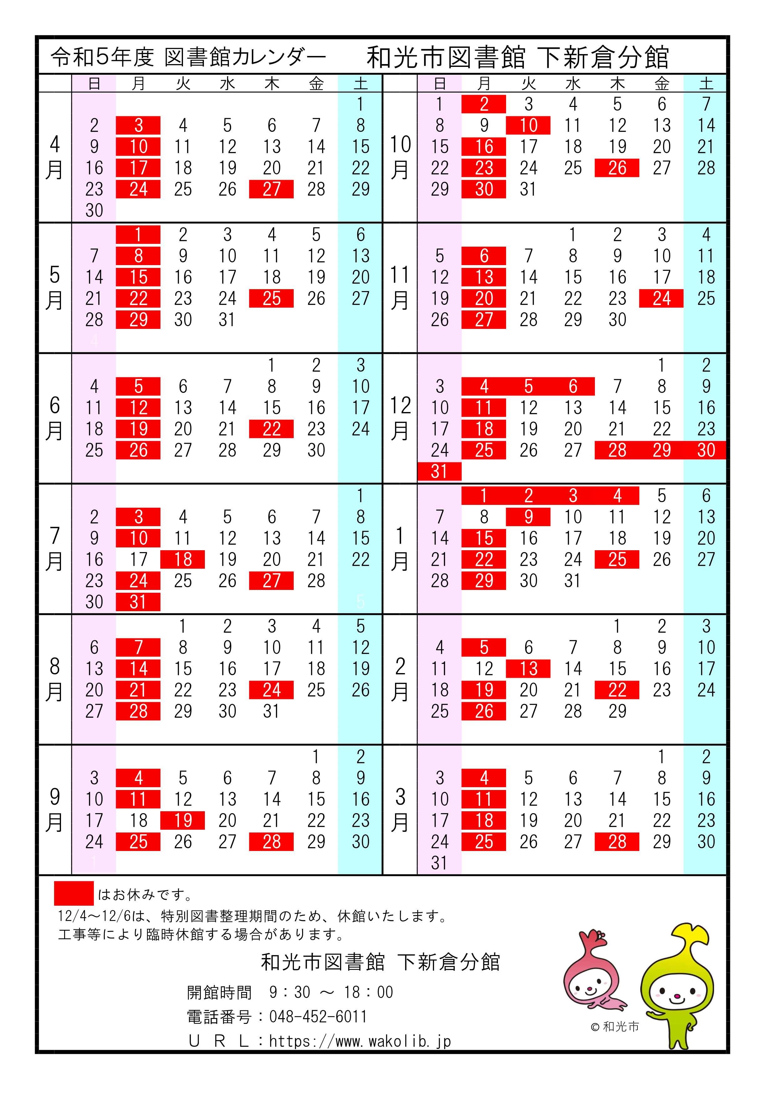 令和5年度 図書館カレンダー(本館&分館)